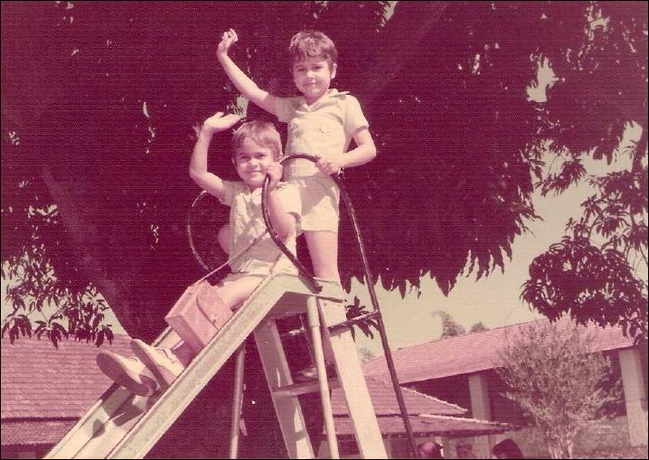 observadas por uma tartaruga, uma menina em pé e um garoto sentado numa