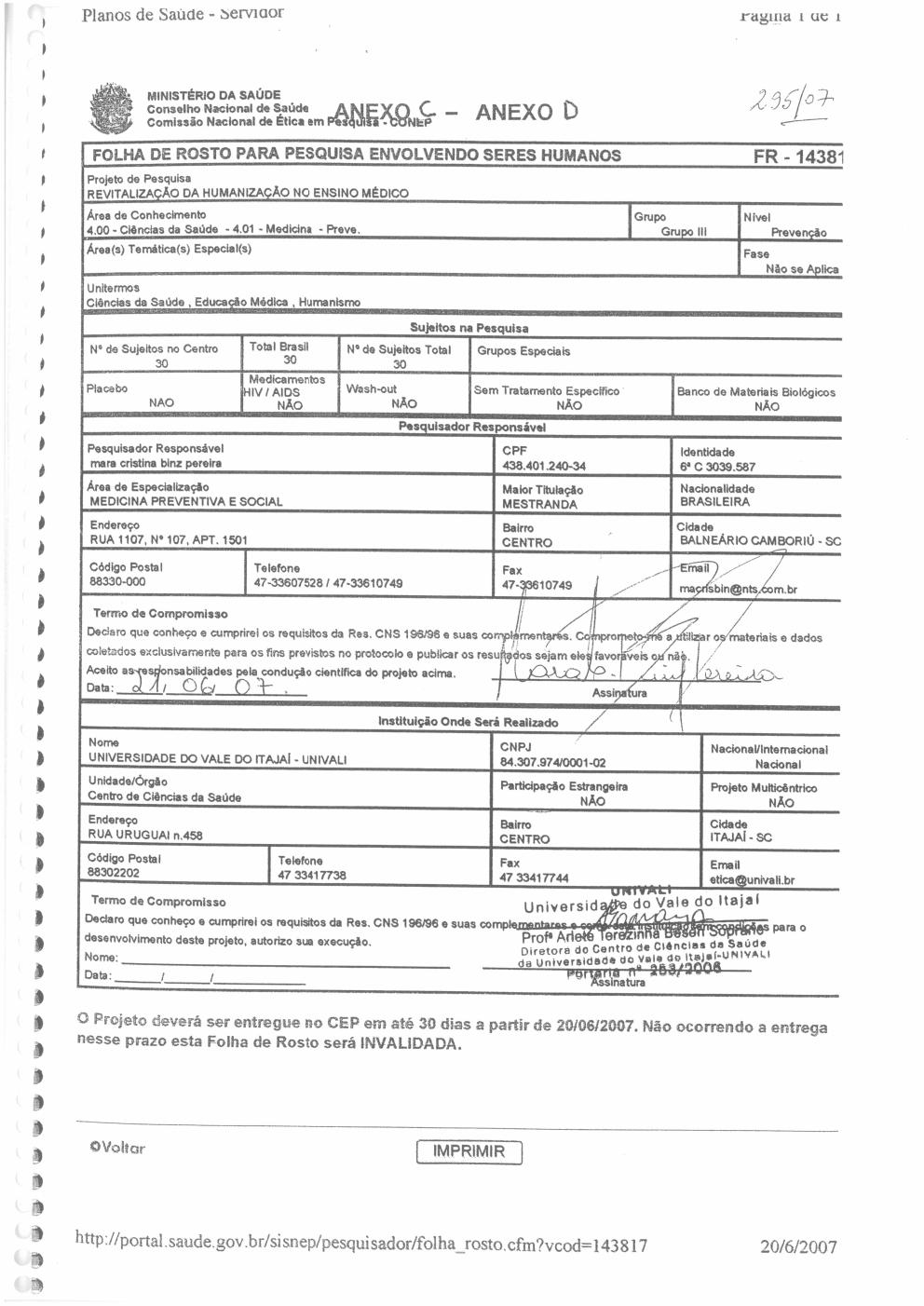 outra do pesquisador responsável.