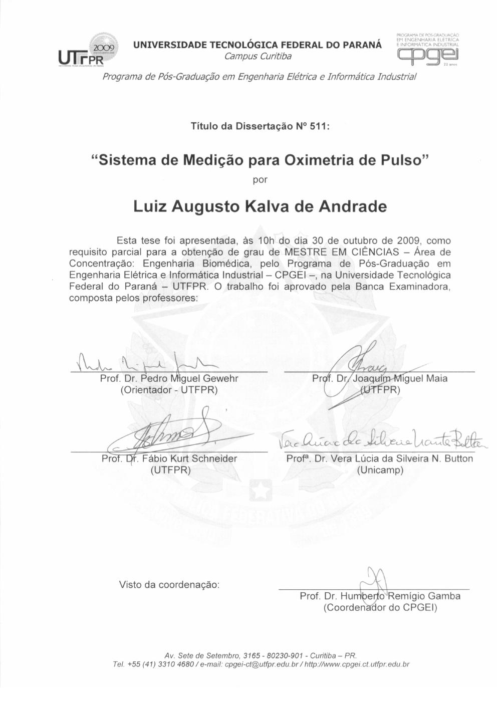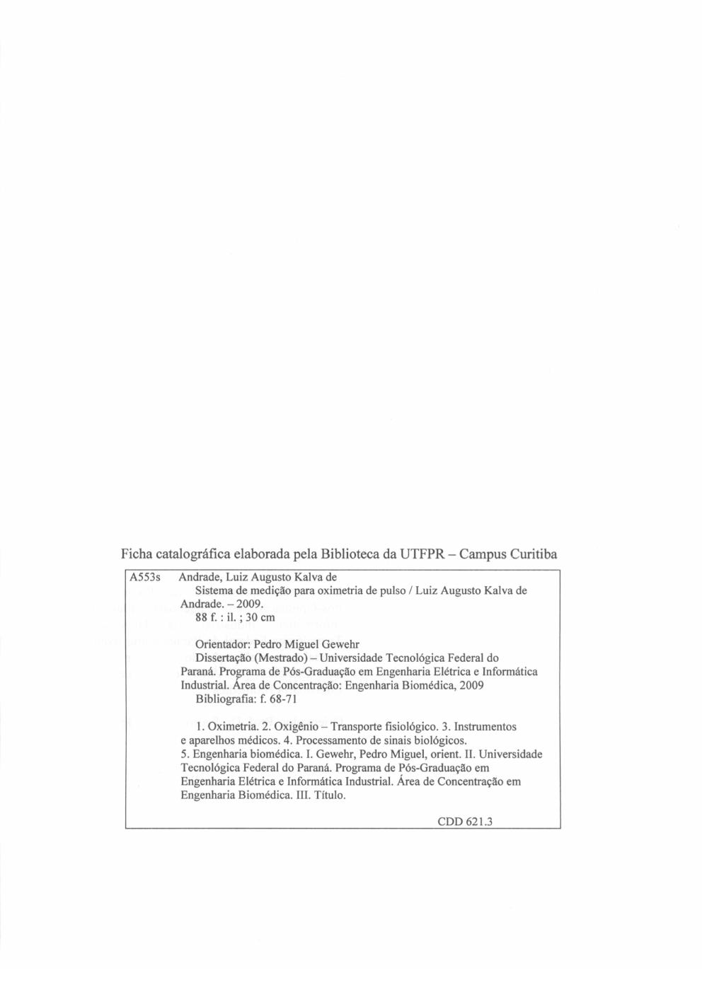 ANDRADE, Luiz Augusto Kalva. Sistema de Medição para Oximetria de Pulso. 2009. 88p.