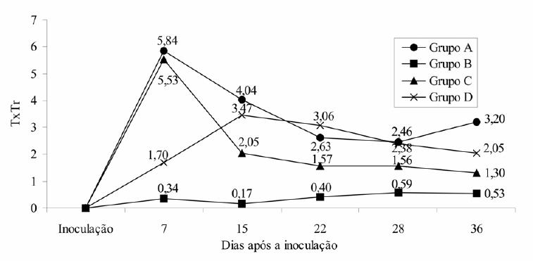 dias da inoculação; TxTr: taxa de infecção aparente; EUR15 e EUR29: número de urediniósporos por urédia aos