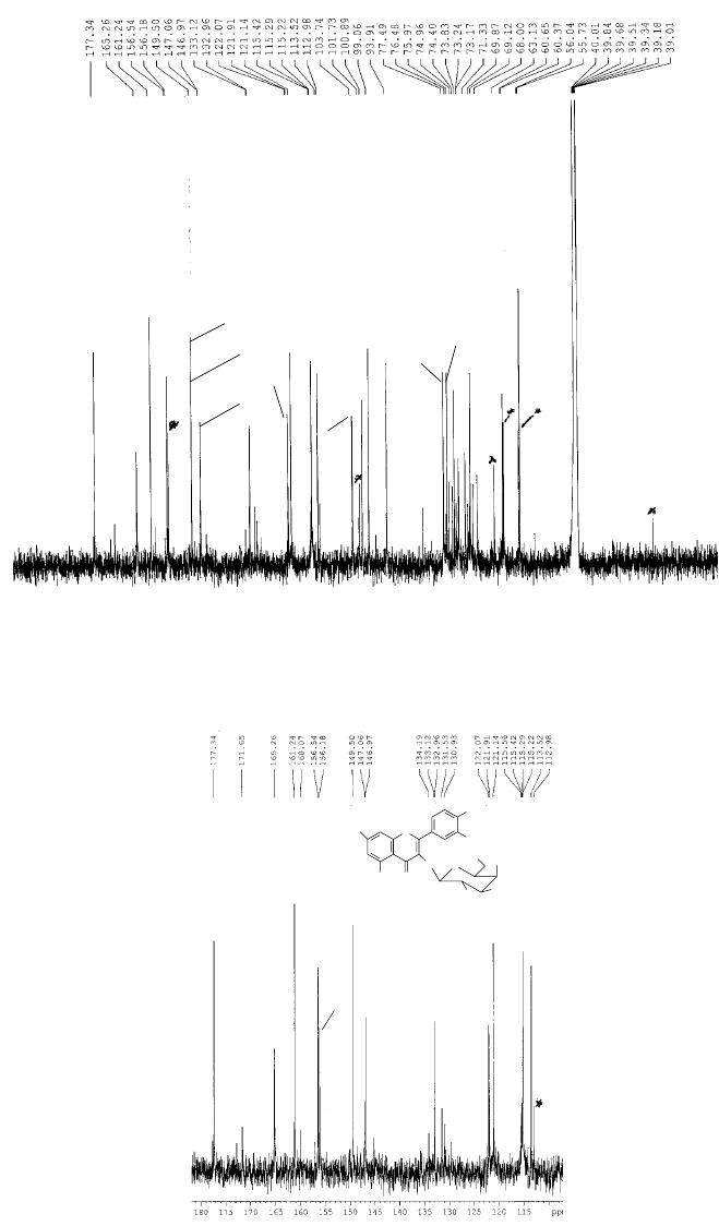 3,35 (m, H-3’’); 3,25 (m, H-4’’); 3,35 (m, H-5’’); 3,78 (m, H-6’’); 13,17(s, HO-5); RMN