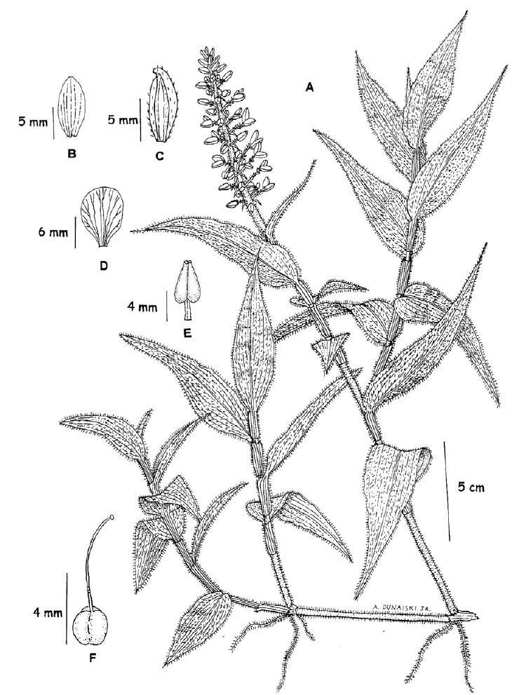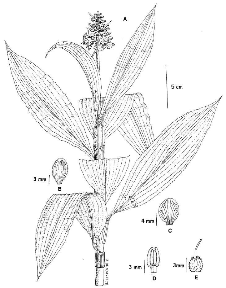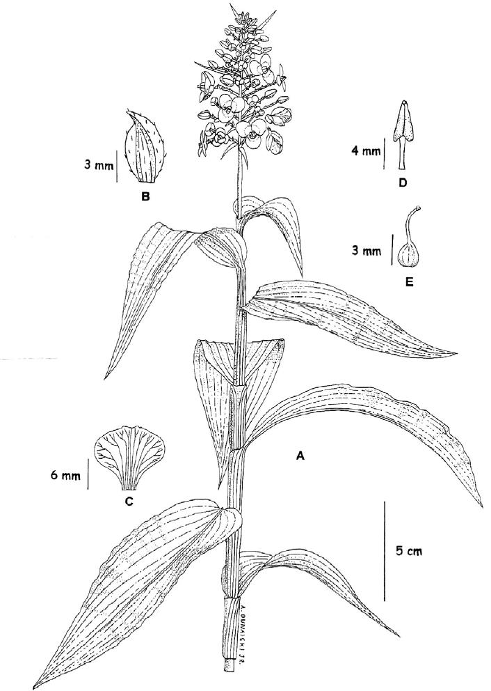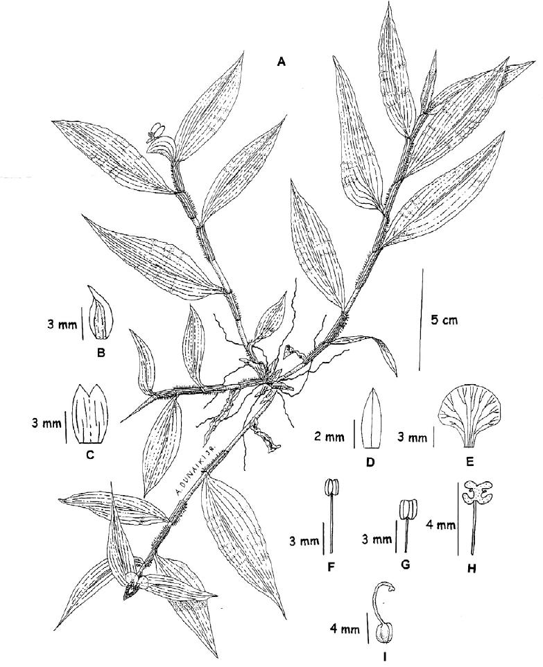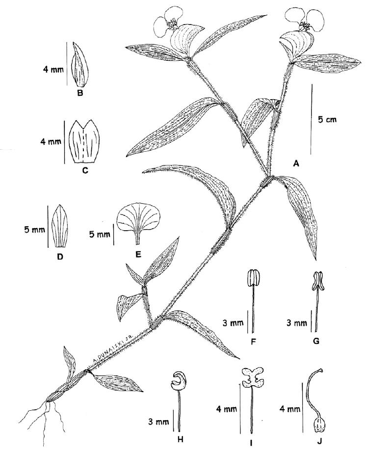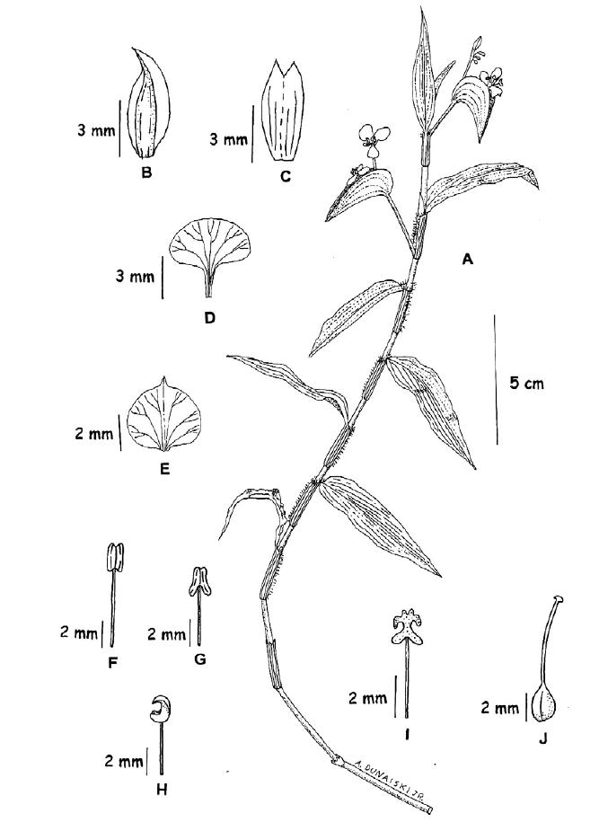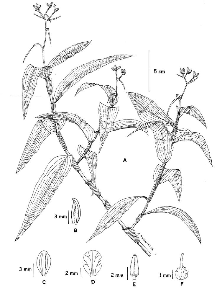 inconspícua, 5,0mm X 1,0mm, elíptica, ápice agudo, alvescente; estames três,